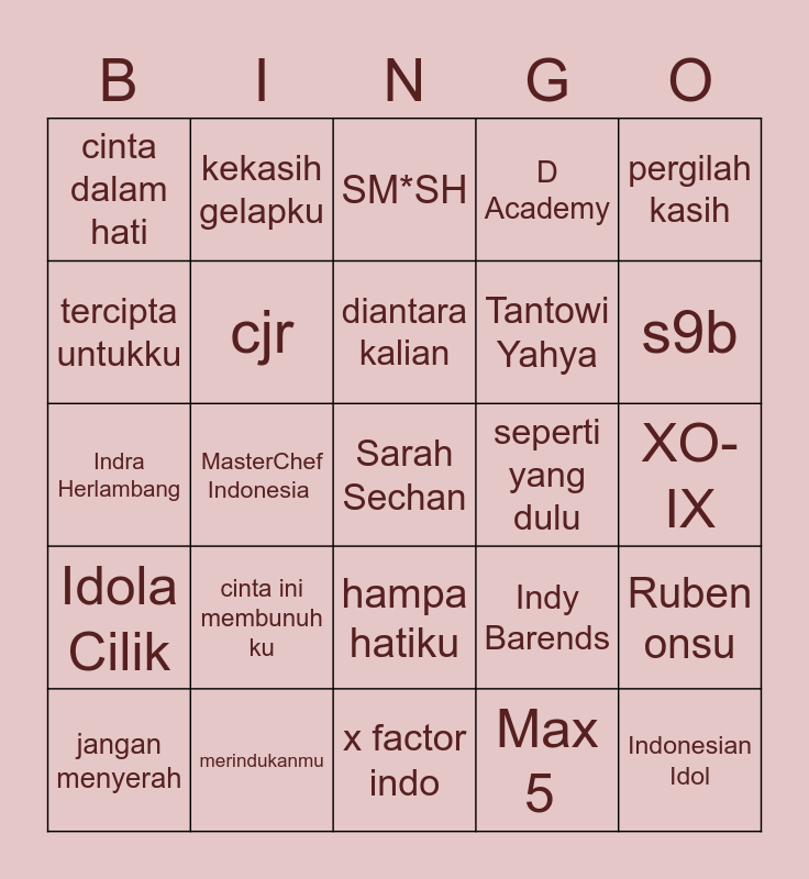 This bingo card has a free space and 24 words: cinta ini membunuh ku, merindukanmu, diantara kalian, jangan menyerah, pergilah kasih, cinta dalam hati, tercipta untukku, kekasih gelapku, seperti yang dulu, hampa hatiku, Tantowi Yahya, Indra Herlambang, Indy Barends, Ruben onsu, cjr, Max 5, XO-IX, SM*SH, s9b, MasterChef Indonesia, Indonesian Idol, Idola Cilik, D Academy and x factor indo.