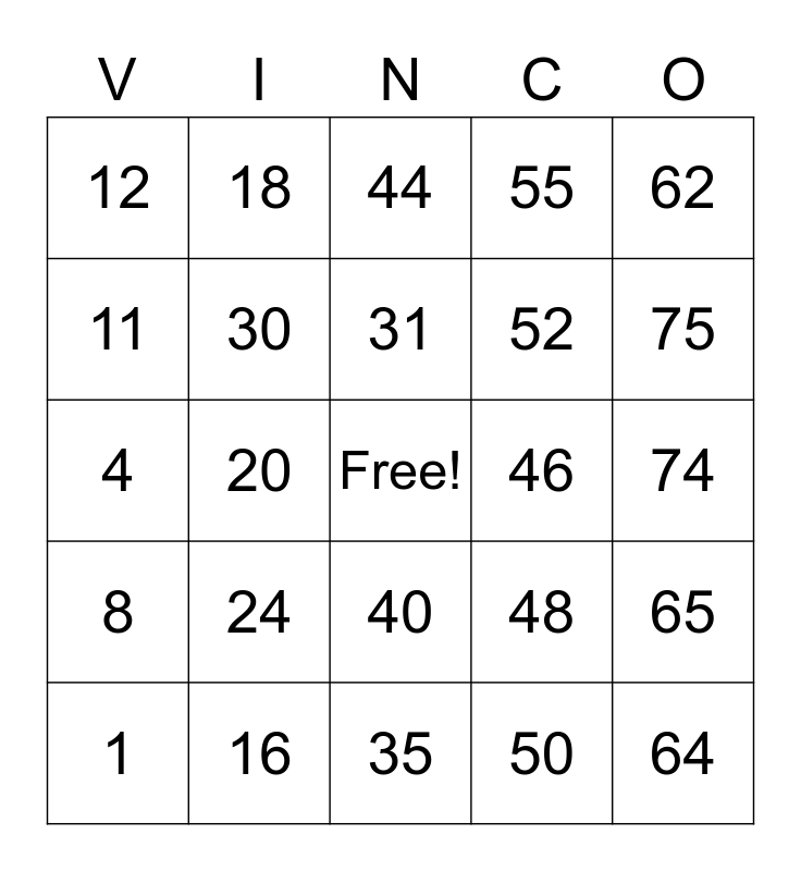 This bingo card has a free space and 24 words: 1, 24, 31, 50, 62, 12, 18, 44, 46, 74, 4, 30, 48, 65, 11, 16, 35, 55, 75, 8, 20, 40, 52 and 64.