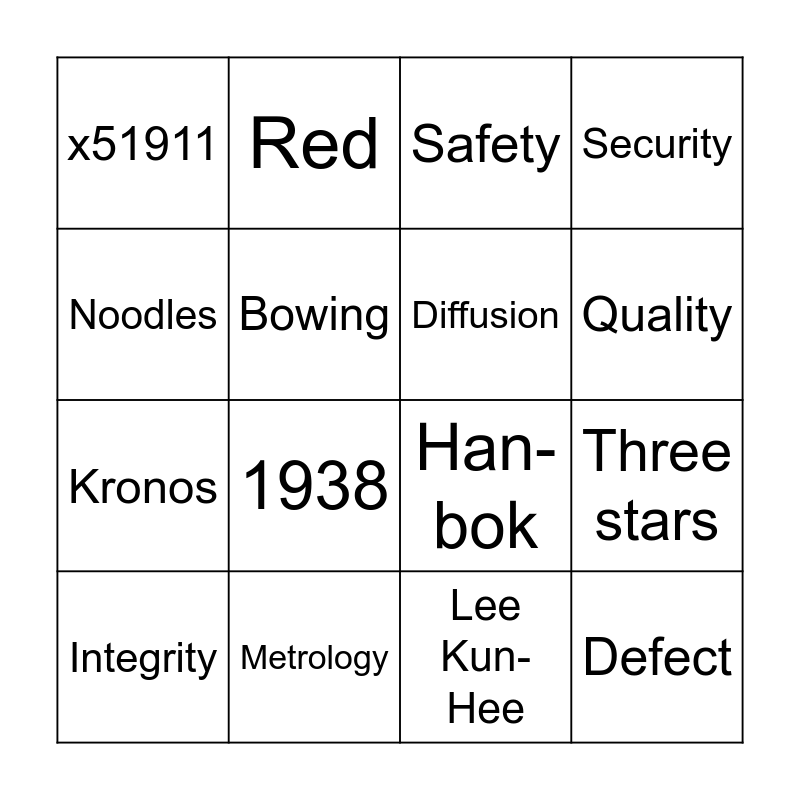 This bingo card has 42 words: Yield, Quality, Teamwork, Learning, Family, Customer, Integrity, Accountability, Safety, Lee Byung-Chull, Lee Kun-Hee, 1938, Three stars, Noodles, 1980’s, $30, Main FAB Expansion, Han-bok, Seol-Nal, Red, Bowing, USB Drive, EMM, x51911, 5, 16, Kronos, UltiPro, Cleans, CMP, CVD, Defect, Diffusion, Etch, General Affairs, Implant, Metals, Metrology, Photo, Quality & Reliability, Security and Talent Development.
