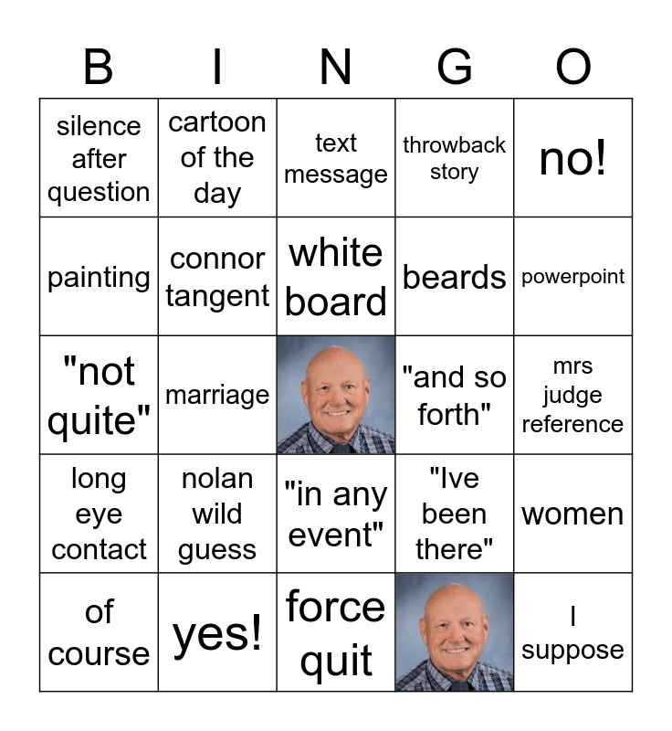 This bingo card has 1 images, a free space and 24 words: nolan wild guess, force quit, white board, of course, no!, silence after question, painting, cartoon of the day, "and so forth", "in any event", beards, "not quite", "Ive been there", women, connor tangent, phone call, mrs judge reference, text message, powerpoint, marriage, I suppose, yes!, long eye contact and throwback story.