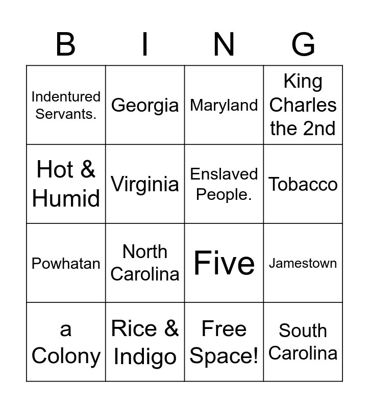 This bingo card has 16 words: Rice & Indigo, Jamestown, Maryland, Indentured Servants., Powhatan, Georgia, Five, Free Space!, Hot & Humid, Virginia, a Colony, King Charles the 2nd, North Carolina, Tobacco, Enslaved People. and South Carolina.