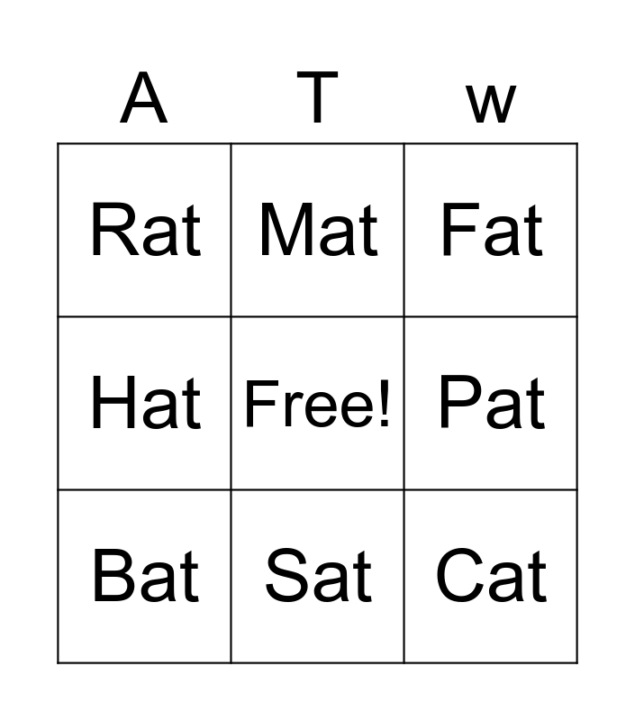 This bingo card has a free space and 8 words: Pat, Fat, Mat, Bat, Rat, Cat, Hat and Sat.