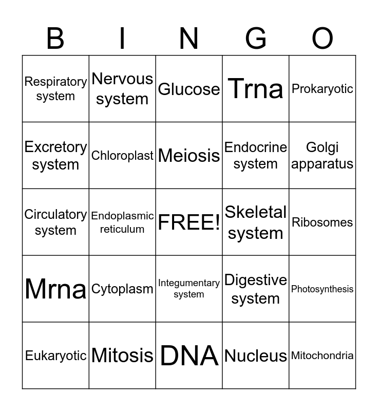 This bingo card has a free space and 24 words: Cytoplasm, Mitosis, Meiosis, Eukaryotic, Prokaryotic, Respiratory system, Excretory system, Nervous system, Skeletal system, Integumentary system, Endocrine system, Circulatory system, Digestive system, Photosynthesis, Chloroplast, Nucleus, Ribosomes, Glucose, Golgi apparatus, Endoplasmic reticulum, Mitochondria, Mrna, Trna and DNA.