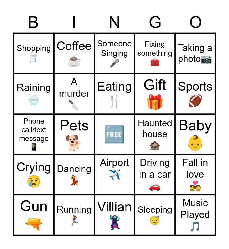 This bingo card has a free space and 26 words: Airport✈️, Sleeping😴, Eating🍴, Running🏃♀️, Taking a photo📷, Shopping 🛒, Raining 🌧️, Coffee ☕, Baby👶, Driving in a car 🚗, Gift🎁, Phone call/text message📱, Fall in love 💑, Gun 🔫, Pets🐕, L.O.L🤣, Fixing something🧰, Crying😢, Someone Singing🎤, Music Played 🎵, Sports🏈, Villian🦹♂️, Haunted house 🏚️, Dancing💃, A murder🔪 and Train 🚆.