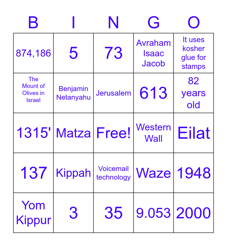 This bingo card has a free space and 24 words: Kippah, 3, Jerusalem, Yom Kippur, It uses kosher glue for stamps, 874,186, The Mount of Olives in Israel, 5, Western Wall, Voicemail technology, 613, 1315', Waze, 1948, Benjamin Netanyahu, 9.053, Eilat, 73, 82 years old, Matza, 2000, 137, Avraham Isaac Jacob and 35.