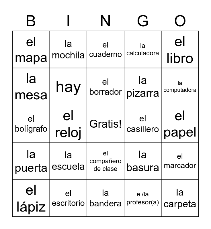 This bingo card has a free space and 26 words: el compañero de clase, el/la profesor(a), el borrador, el escritorio, el libro, el mapa, la mesa, la mochila, el papel, la basura, la pizarra, el bolígrafo, el marcador, el lápiz, el reloj, la silla, la calculadora, la puerta, el cuaderno, la carpeta, la computadora, la bandera, el casillero, la escuela, hay and el/la estudiante.