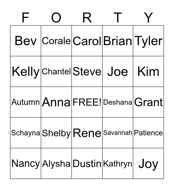 This bingo card has a free space and 30 words: Alysha, Amy, Anna, Becky, Bev, Carol, Chantel, Rene, Deshana, Dustin, Grant, Joy, Kathryn, Kayla, Kim, Rob, Savannah, Schayna, Shelby, Tyler, Autumn, Fred, Corale, Joe, Kelly, Brian, Patience, Nancy, Steve and Trina.