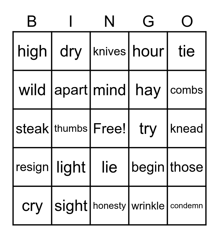 This bingo card has a free space and 24 words: light, sight, mind, cry, tie, high, wild, dry, try, lie, hay, steak, begin, those, apart, wrinkle, knead, knives, combs, thumbs, condemn, resign, hour and honesty.