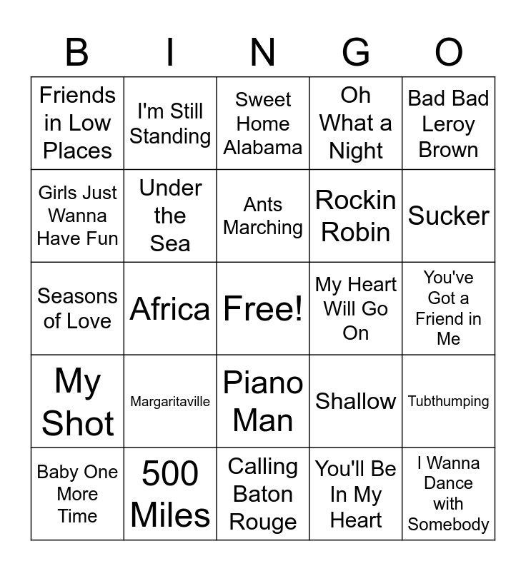 This bingo card has a free space and 24 words: Margaritaville, 500 Miles, Ants Marching, Baby One More Time, Bad Bad Leroy Brown, Friends in Low Places, Girls Just Wanna Have Fun, I'm Still Standing, My Heart Will Go On, Piano Man, Rockin Robin, Seasons of Love, Shallow, Tubthumping, Under the Sea, You'll Be In My Heart, You've Got a Friend in Me, Sweet Home Alabama, Sucker, Africa, I Wanna Dance with Somebody, My Shot, Oh What a Night and Calling Baton Rouge.