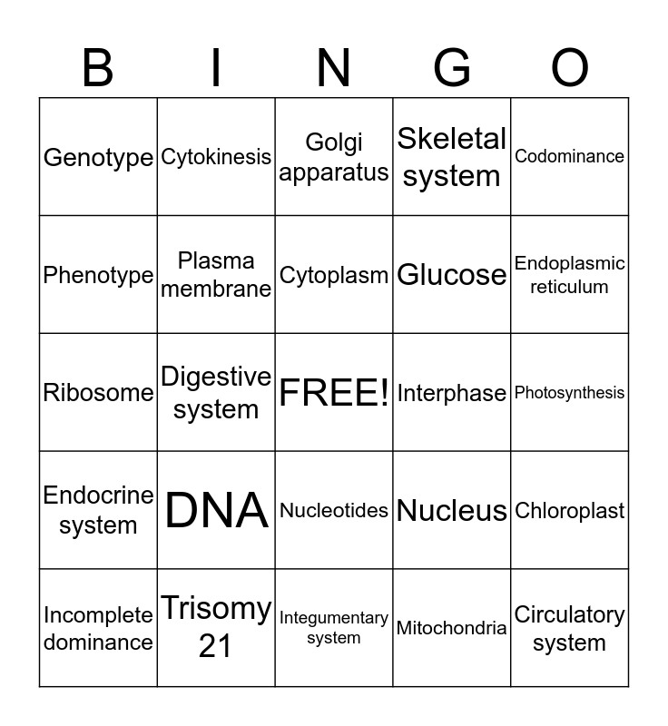 This bingo card has a free space and 24 words: DNA, Trisomy 21, Cytoplasm, Incomplete dominance, Codominance, Genotype, Phenotype, Cytokinesis, Interphase, Nucleotides, Glucose, Ribosome, Nucleus, Chloroplast, Plasma membrane, Mitochondria, Photosynthesis, Golgi apparatus, Endoplasmic reticulum, Digestive system, Circulatory system, Endocrine system, Skeletal system and Integumentary system.