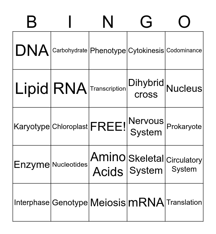 This bingo card has a free space and 24 words: Nucleotides, Genotype, Transcription, Interphase, Codominance, DNA, Lipid, Carbohydrate, Nervous System, Amino Acids, Dihybrid cross, Karyotype, Skeletal System, Circulatory System, RNA, mRNA, Prokaryote, Phenotype, Nucleus, Chloroplast, Translation, Enzyme, Cytokinesis and Meiosis.