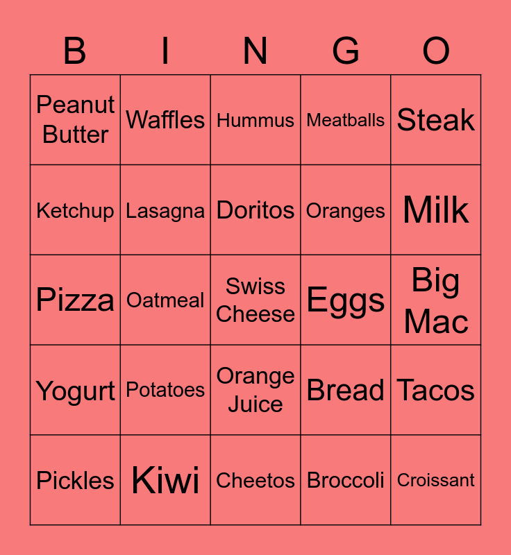 This bingo card has 30 words: Kiwi, Chicken Wings, Oatmeal, Salmon, Peanut Butter, Hummus, Lasagna, Orange Juice, Eggs, Cheetos, Big Mac, Swiss Cheese, Broccoli, Croissant, Milk, Kale, Bread, Yogurt, Potatoes, Steak, Pizza, Almonds, Waffles, Oranges, Ketchup, Meatballs, Tacos, Pickles, Doritos and Tuna.