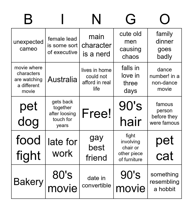 This bingo card has a free space and 39 words: female friends are the worst, road trip!, talking animals, Australia, Bakery, gay best friend, lives in home could not afford in real life, flashback!, family dinner goes badly, food fight, gets back together after loosing touch for years, cute old men causing chaos, something resembling a hobbit, famous person before they were famous, 90's hair, late for work, miscommunication / assumption leading to breakup of main couple, unexpected cameo, Ye Olde English ish, fight involving chair or other piece of furniture, movie where characters are watching a different movie, date in convertible, falls in love in three days, dance number! in a non-dance movie, faeries, parents trying to marry off kid, gunfight!, goes to bar to find a date, obnoxious younger sibling, female lead is some sort of executive, male lead is some sort of athlete, witches wizards warlocks, main character is a nerd, 80's movie, 90's movie, 70's clothes, pet cat, pet dog and pet store.