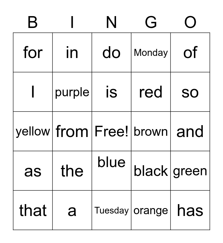 This bingo card has a free space and 24 words: the, a, is, that, of, for, I, in, brown, blue, red, yellow, black, green, purple, orange, and, do, so, from, has, as, Monday and Tuesday.