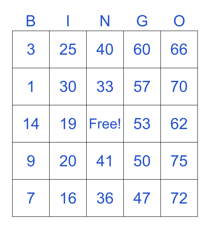 This bingo card has a free space and 24 words: 7, 20, 33, 47, 66, 3, 25, 40, 53, 62, 14, 30, 50, 75, 1, 16, 36, 60, 70, 9, 19, 41, 57 and 72.