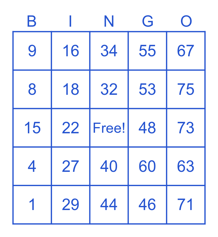 This bingo card has a free space and 24 words: 1, 27, 32, 46, 67, 9, 16, 34, 48, 73, 15, 18, 60, 63, 8, 29, 44, 55, 75, 4, 22, 40, 53 and 71.