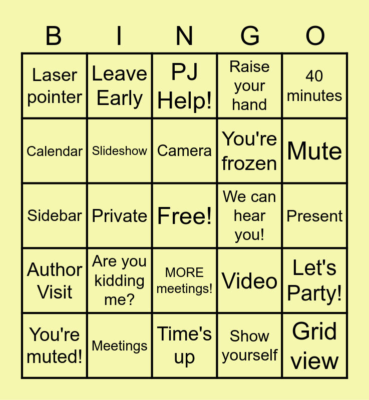 This bingo card has a free space and 34 words: Pin It, Show yourself, Chat, Zzzzz!, Author Visit, Slideshow, 40 minutes, You're muted!, Leave Early, Conference, Camera, PJ Help!, The Children Have NO Direction!, Is it over yet?, We can hear you!, Mute, Meetings, Sidebar, Are you kidding me?, Video, MORE meetings!, Breakout, Laser pointer, Present, Time's up, Grid view, Raise your hand, How do I look?, You're frozen, Calendar, Volume, Private, Let's Party! and You look fabulous!.