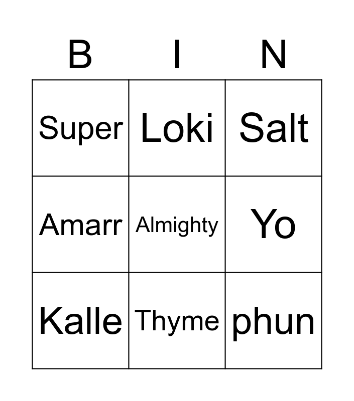 This bingo card has a free space and 8 words: Yo, Salt, Loki, Kalle, Super, phun, Amarr and Thyme.