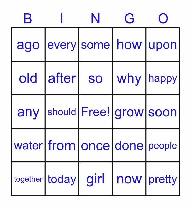 This bingo card has a free space and 30 words: away, today, some, buy, upon, ago, after, so, why, pretty, together, from, now, work, water, way, girl, grow, people, old, should, green, how, soon, any, every, once, done, happy and boy.
