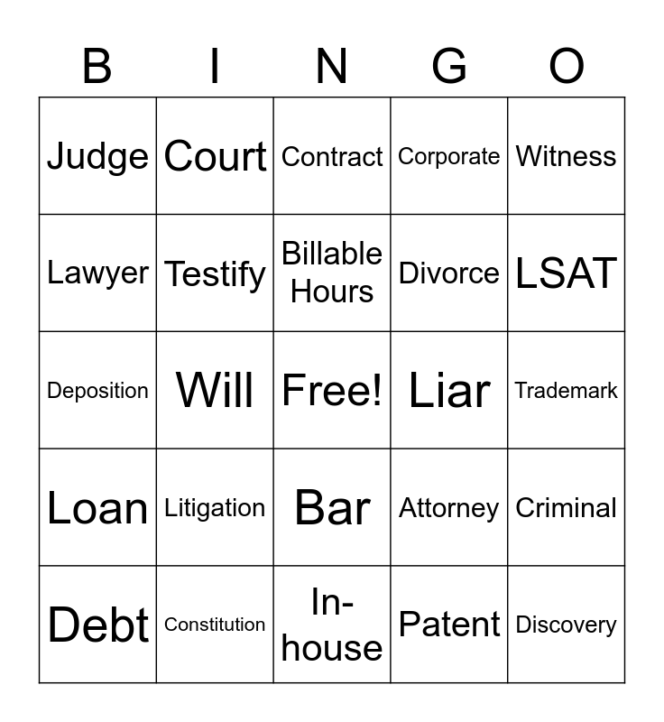 This bingo card has a free space and 24 words: Litigation, Constitution, Billable Hours, Debt, Witness, Judge, Lawyer, Court, Liar, Bar, Divorce, Deposition, Attorney, Criminal, Testify, Patent, Trademark, Contract, LSAT, Will, Discovery, Loan, Corporate and In-house.