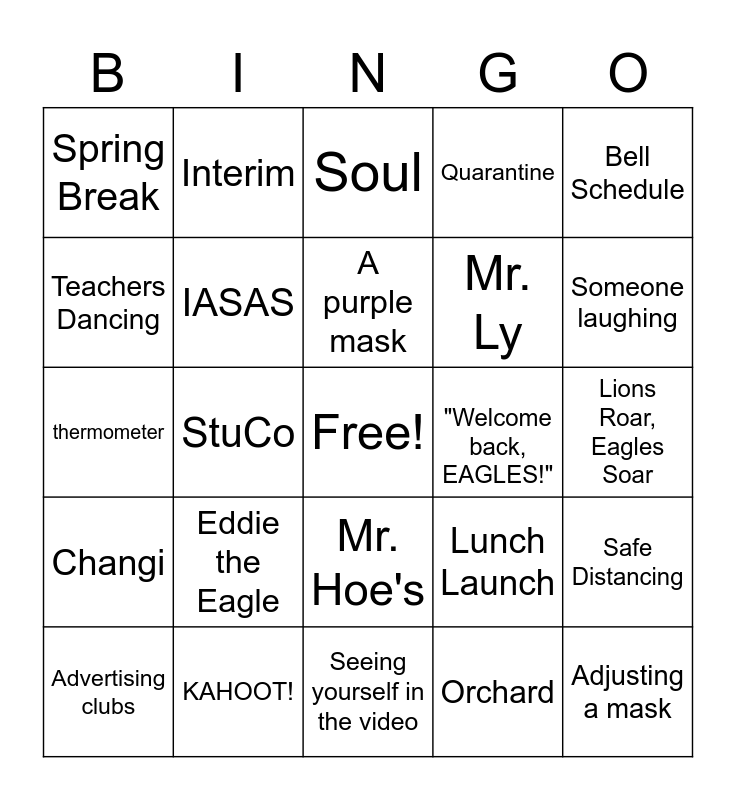 This bingo card has a free space and 49 words: Sentosa, Adjusting a mask, Someone from our advisory, Seeing yourself in the video, Eddie the Eagle, Core Values, Interim, someone doing a backflip, Teachers Dancing, Coach MacKinnon Playing Basketball, IASAS, Quarantine, Safe Distancing, Lunch Launch, No mention of uniforms, Eat Fresh, A purple mask, "Welcome back, EAGLES!", Graduation, Bell Schedule, StuCo, Orchard, Spring Break, Mr. Ly, A ringing cellphone, Someone laughing, Advertising clubs, Senior Privilege, Mr. Hoe's, Changi, Botanic Gardens, Bali, Study Hall, A corny joke, KAHOOT!, a British accent, Trace Together Token, 2021, Lions Roar, Eagles Soar, school spirit, Town Hall, Subway, E Day, science, thermometer, Soul, "You're on mute", service and Zoom.