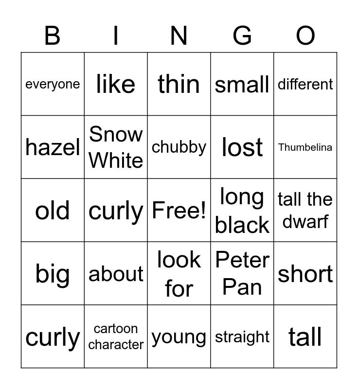 This bingo card has a free space and 24 words: about, cartoon character, chubby, curly, different, everyone, hazel, like, long black, look for, lost, old, Peter Pan, short, Snow White, straight, tall the dwarf, thin, Thumbelina, curly, tall, big, small and young.