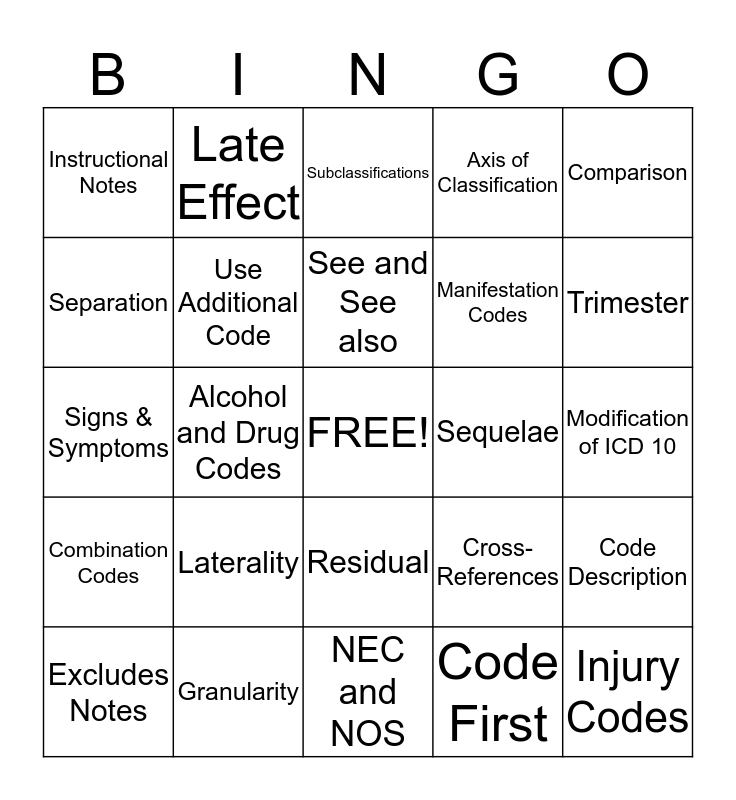 This bingo card has a free space and 24 words: Laterality, Granularity, See and See also, Excludes Notes, Comparison, Instructional Notes, Separation, Late Effect, Sequelae, Residual, Manifestation Codes, Signs & Symptoms, Cross-References, Code Description, Use Additional Code, Code First, Modification of ICD 10, Subclassifications, Trimester, Alcohol and Drug Codes, Injury Codes, Combination Codes, Axis of Classification and NEC and NOS.