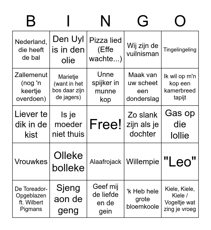 This bingo card has a free space and 52 words: Mien waar is mijn feestneus - Toon Hermans, Kiele, Kiele, Kiele / Vogeltje wat zing je vroeg, Bij ons staat op de keukendeur, Geef mij de liefde en de gein, Olleke bolleke, Maar wie holt van mekaar (en Adam sleug Eva), Den Uyl is in den olie, Kiele kiele Koeweit, Zallemenut (nog 'n keertje overdoen), Zak es lekker door, Marietje (want in het bos daar zijn de jagers), De liefde van de man gaat door de maag, "Leo", Willempie, Als het gras twee kontjes hoog is, Stoont als een garnaal, Unne spijker in munne kop, Zo slank zijn als je dochter, Limburgs klaaglied, Tingelingeling, Is je moeder niet thuis, 'k Heb hele grote bloemkoole, Nederland, die heeft de bal, Maak van uw scheet een donderslag, Bloemetjesgordijn, Flip Fluitketel/Er staat een paard in de gang, Een barg die he un krul in de steert, Net as gisteren, Ik wil op m'n kop een kamerbreed tapijt, Mama, woar is mien pils, Polonaise Hollandaise, Wij zijn de vuilnisman, Kleine Jodeljongen, Maar vanavond heb ik hoofdpijn, Overal lagen peuken, Pizza lied (Effe wachte...), Sjeng aon de geng, Boem is ho, tuut tuut, Lauwe pis, De balletjes van de koningin, Zachte G Harde L, Gas op die lollie, Vrouwkes, De Gròzzie van Mèn Buurvrouw, Alaafrojack, Jij krijgt die lach niet van mijn gezicht, Links Rechts, Liever te dik in de kist, Hallo Allemaal, Alie Exprezz-Gebroeders Rossig, De Toreador-Opgeblazen ft. Wilbert Pigmans and Handjes handjes bloemetjesgordijn - Lamme Frans.