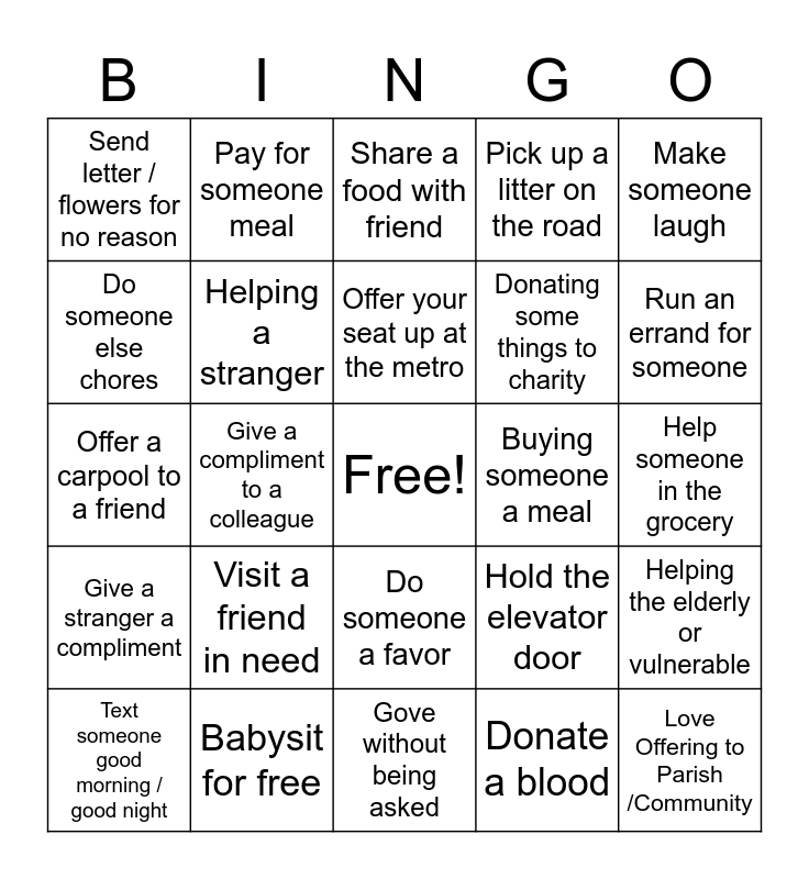 This bingo card has a free space and 24 words: Visit a friend in need, Babysit for free, Offer your seat up at the metro, Text someone good morning / good night, Make someone laugh, Send letter / flowers for no reason, Do someone else chores, Pay for someone meal, Buying someone a meal, Do someone a favor, Donating some things to charity, Offer a carpool to a friend, Hold the elevator door, Helping the elderly or vulnerable, Helping a stranger, Donate a blood, Help someone in the grocery, Share a food with friend, Run an errand for someone, Give a compliment to a colleague, Love Offering to Parish /Community, Give a stranger a compliment, Pick up a litter on the road and Gove without being asked.