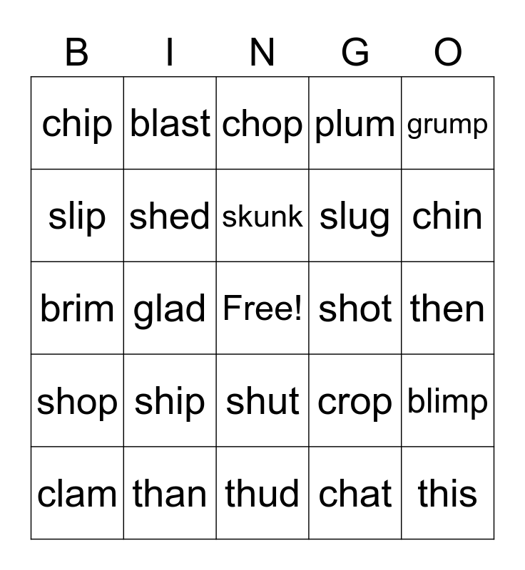 This bingo card has a free space and 29 words: clam, flag, glad, chap, chip, chop, shed, ship, shot, than, then, this, thud, chat, chin, chum, shut, shop, grump, brim, crop, draft, slug, slip, plum, blast, blimp, skunk and prod.