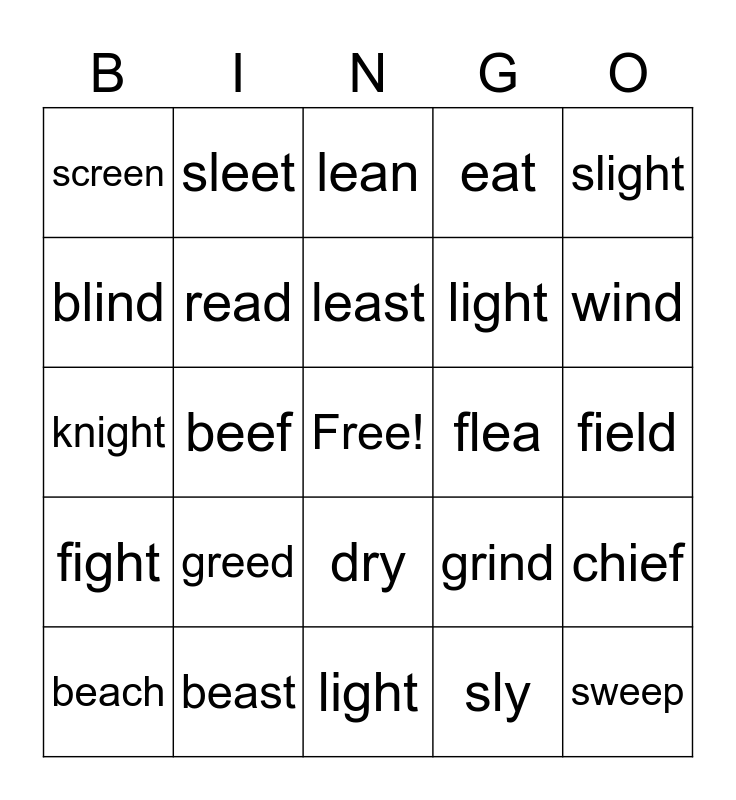 This bingo card has a free space and 29 words: beach, brief, beef, keep, screen, lean, read, greed, flea, beast, field, sweep, light, sly, wind, why, dry, fight, slight, knight, grind, spry, light, blind, eat, sleet, chief, least and peach.