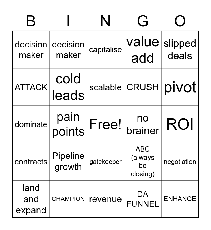 This bingo card has a free space and 24 words: Pipeline growth, CHAMPION, scalable, land and expand, slipped deals, decision maker, ATTACK, decision maker, no brainer, gatekeeper, CRUSH, dominate, ABC (always be closing), negotiation, cold leads, DA FUNNEL, ROI, capitalise, pivot, pain points, ENHANCE, contracts, value add and revenue.