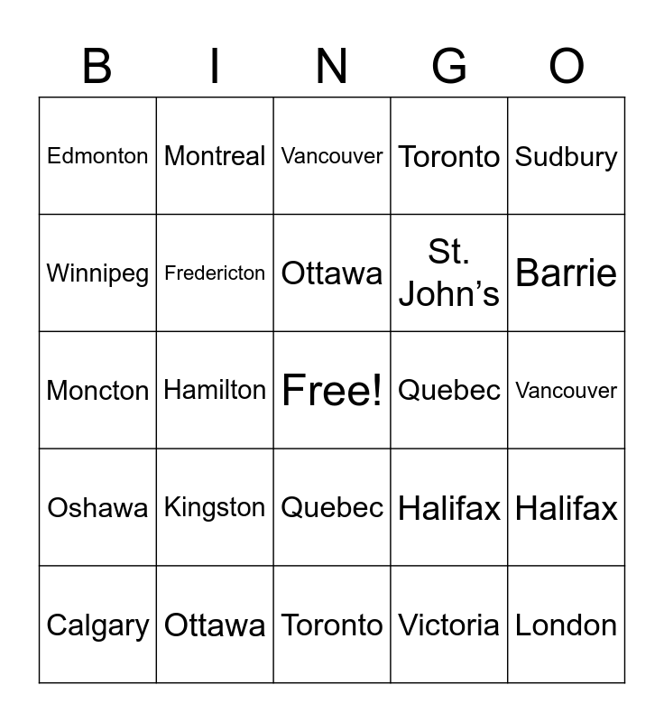 This bingo card has a free space and 24 words: Kingston, Ottawa, Ottawa, Calgary, Sudbury, Edmonton, Winnipeg, Montreal, Quebec, Quebec, St. John’s, Moncton, Halifax, Halifax, Fredericton, Victoria, Vancouver, Vancouver, Barrie, Hamilton, London, Oshawa, Toronto and Toronto.