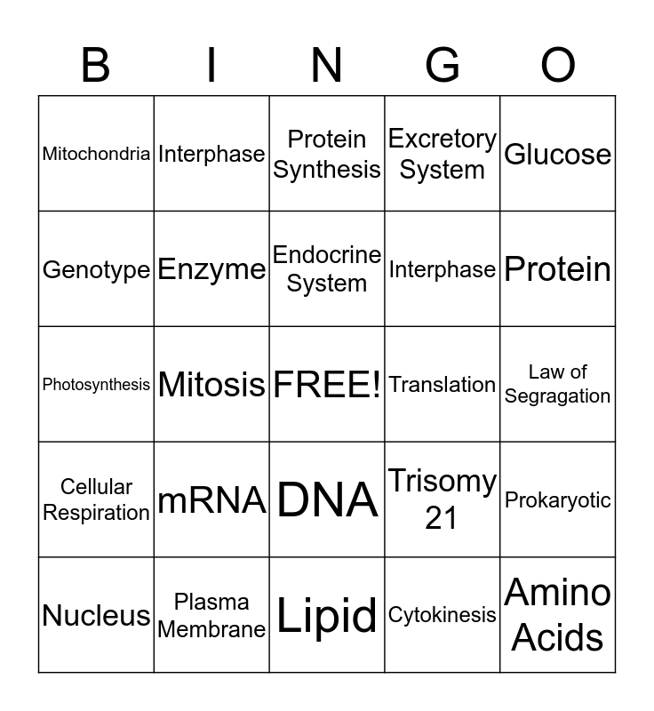 This bingo card has a free space and 24 words: mRNA, Plasma Membrane, Endocrine System, Nucleus, Glucose, Mitochondria, Genotype, Interphase, Translation, DNA, Interphase, Photosynthesis, Trisomy 21, Prokaryotic, Enzyme, Cytokinesis, Law of Segragation, Protein Synthesis, Protein, Mitosis, Amino Acids, Cellular Respiration, Excretory System and Lipid.