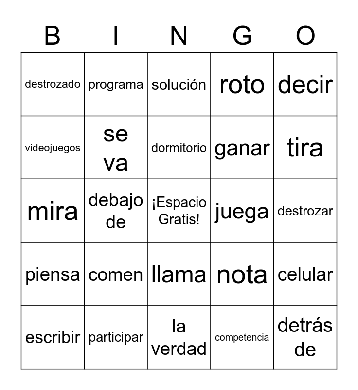 This bingo card has a free space and 24 words: comen, participar, dormitorio, escribir, decir, destrozado, videojuegos, programa, juega, llama, ganar, mira, nota, celular, se va, competencia, destrozar, solución, tira, debajo de, detrás de, piensa, roto and la verdad.