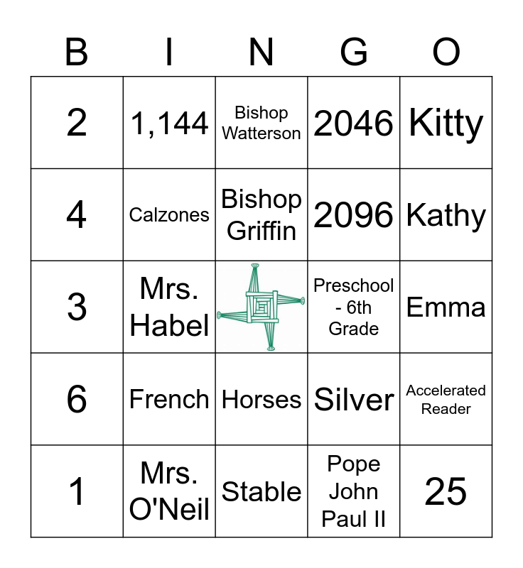 This bingo card has a free space and 24 words: 1, French, Bishop Griffin, Pope John Paul II, Kitty, 2, 1,144, Bishop Watterson, Preschool - 6th Grade, Emma, 3, Calzones, Silver, Accelerated Reader, 4, Mrs. O'Neil, Stable, 2046, Kathy, 6, Mrs. Habel, Horses, 2096 and 25.