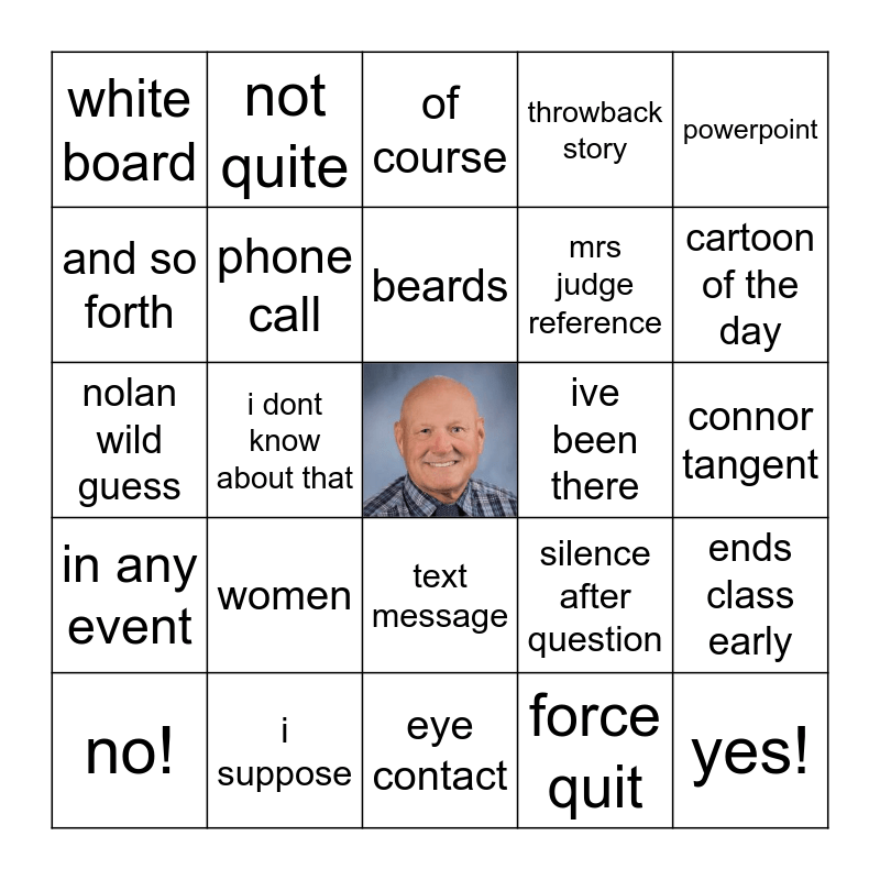 This bingo card has a free space and 24 words: women, i suppose, beards, no!, powerpoint, white board, and so forth, not quite, ive been there, text message, mrs judge reference, nolan wild guess, silence after question, ends class early, phone call, force quit, connor tangent, of course, cartoon of the day, i dont know about that, yes!, in any event, throwback story and eye contact.