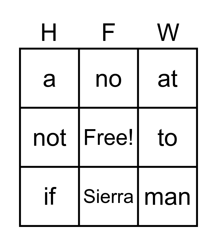 This bingo card has a free space and 8 words: to, at, no, if, a, man, not and Sierra.