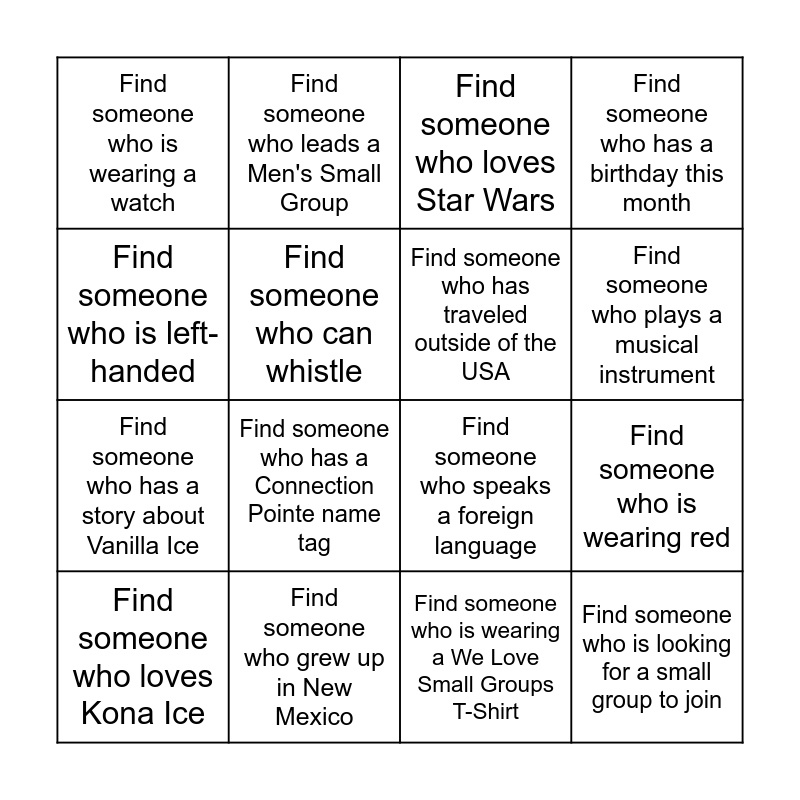 This bingo card has 16 words: Find someone who grew up in New Mexico, Find someone who is wearing red, Find someone who loves Star Wars, Find someone who is wearing a watch, Find someone who has a story about Vanilla Ice, Find someone who leads a Men's Small Group, Find someone who speaks a foreign language, Find someone who is wearing a We Love Small Groups T-Shirt, Find someone who is left- handed, Find someone who can whistle, Find someone who loves Kona Ice, Find someone who has a birthday this month, Find someone who has a Connection Pointe name tag, Find someone who plays a musical instrument, Find someone who has traveled outside of the USA and Find someone who is looking for a small group to join.