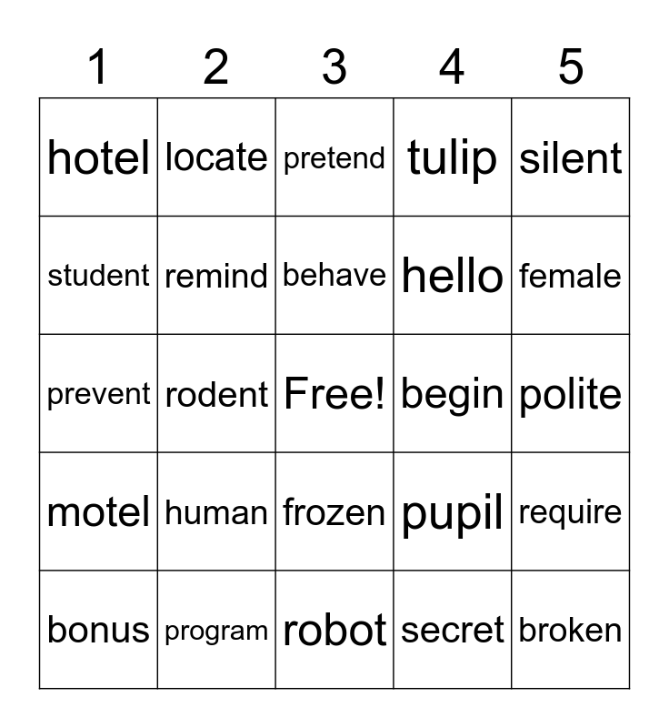 This bingo card has a free space and 24 words: human, program, behave, bonus, silent, hotel, student, locate, begin, frozen, hello, prevent, pupil, require, remind, secret, polite, pretend, female, rodent, broken, motel, tulip and robot.