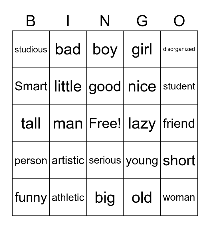 This bingo card has a free space and 24 words: artistic, athletic, good, funny, disorganized, studious, Smart, bad, lazy, serious, nice, tall, young, short, little, old, friend, boy, student, man, woman, person, girl and big.