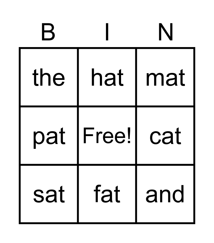 This bingo card has a free space and 8 words: cat, mat, hat, sat, the, and, pat and fat.