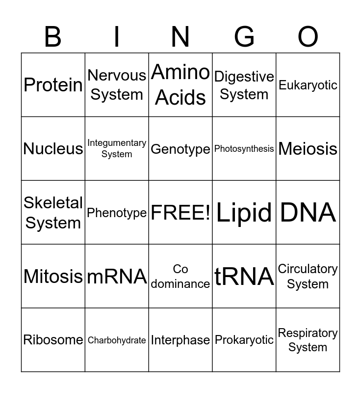 This bingo card has a free space and 24 words: mRNA, Charbohydrate, Genotype, Ribosome, Eukaryotic, Protein, Nucleus, Nervous System, Lipid, Co dominance, Photosynthesis, Skeletal System, tRNA, Circulatory System, Integumentary System, Prokaryotic, DNA, Amino Acids, Meiosis, Phenotype, Respiratory System, Mitosis, Digestive System and Interphase.