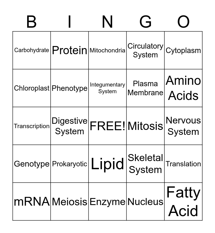 This bingo card has a free space and 24 words: Prokaryotic, Meiosis, Integumentary System, mRNA, Cytoplasm, Carbohydrate, Chloroplast, Protein, Mitosis, Lipid, Plasma Membrane, Transcription, Skeletal System, Translation, Phenotype, Nucleus, Nervous System, Mitochondria, Amino Acids, Digestive System, Fatty Acid, Genotype, Circulatory System and Enzyme.