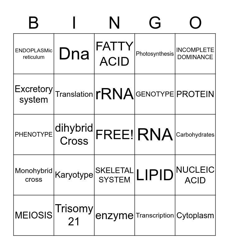 This bingo card has a free space and 24 words: Karyotype, Trisomy 21, rRNA, MEIOSIS, INCOMPLETE DOMINANCE, ENDOPLASMic reticulum, Excretory system, Dna, RNA, SKELETAL SYSTEM, GENOTYPE, PHENOTYPE, LIPID, NUCLEIC ACID, Translation, Transcription, Carbohydrates, FATTY ACID, PROTEIN, dihybrid Cross, Cytoplasm, Monohybrid cross, Photosynthesis and enzyme.