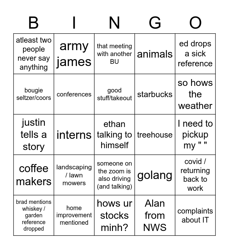 This bingo card has a free space and 24 words: landscaping / lawn mowers, home improvement mentioned, good stuff/takeout, brad mentions whiskey / garden reference dropped, ed drops a sick reference, atleast two people never say anything, bougie seltzer/coors, army james, treehouse, someone on the zoom is also driving (and talking), starbucks, justin tells a story, golang, covid / returning back to work, conferences, Alan from NWS, I need to pickup my " ", that meeting with another BU, so hows the weather, interns, complaints about IT, coffee makers, animals and hows ur stocks minh?.