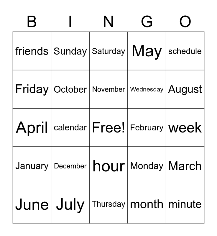 This bingo card has a free space and 27 words: Monday, Tuesday, Wednesday, Thursday, Friday, Saturday, Sunday, January, February, March, April, May, June, July, August, September, October, November, December, friends, week, month, calendar, minute, hour, schedule and goal.