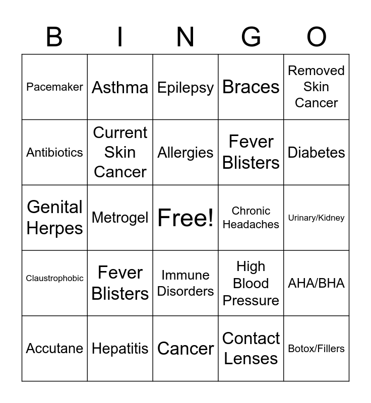 This bingo card has a free space and 34 words: Pregnancy, Contact Lenses, Smoker, Alcohol, Claustrophobic, Current Skin Cancer, Removed Skin Cancer, Accutane, Asthma, Eczema, Allergies, Epilepsy, Diuretics, Diet Pills, Chronic Headaches, Diabetes, Hepatitis, Genital Herpes, Fever Blisters, High Blood Pressure, Immune Disorders, Lupus, Pacemaker, Urinary/Kidney, Cancer, Botox/Fillers, Braces, Caffeine, UV, Smoking, Fever Blisters, Antibiotics, Steroids, Metrogel, AHA/BHA and Hysterectomy/ HRT.