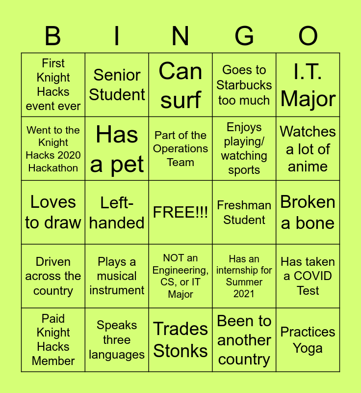 This bingo card has a free space and 24 words: Plays a musical instrument, Speaks three languages, Part of the Operations Team, Paid Knight Hacks Member, I.T. Major, First Knight Hacks event ever, Went to the Knight Hacks 2020 Hackathon, Senior Student, Freshman Student, NOT an Engineering, CS, or IT Major, Enjoys playing/ watching sports, Loves to draw, Has an internship for Summer 2021, Has taken a COVID Test, Has a pet, Been to another country, Broken a bone, Can surf, Watches a lot of anime, Left-handed, Practices Yoga, Driven across the country, Goes to Starbucks too much and Trades Stonks.