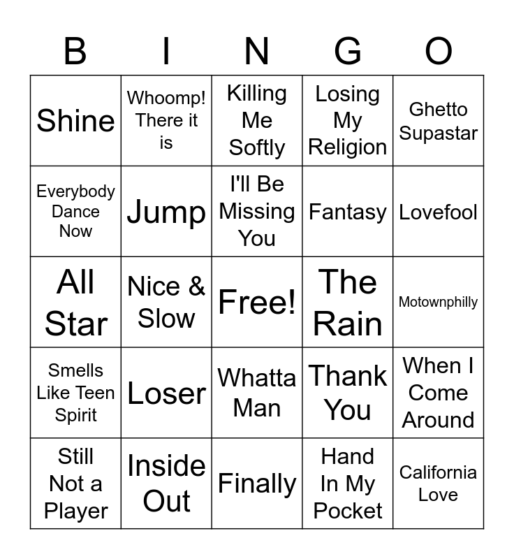 This bingo card has a free space and 32 words: Hand In My Pocket, Wannabe, Nice & Slow, Wonderwall, Smells Like Teen Spirit, Jump, Ghetto Supastar, When I Come Around, Whoomp! There it is, No Scrubs, I'll Be Missing You, Killing Me Softly, All the Small Things, Too Close, The Rain, I Want You, Still Not a Player, All Star, Whatta Man, Loser, Thank You, MMMBop, Motownphilly, Inside Out, California Love, Losing My Religion, Fantasy, Everybody Dance Now, Shine, Finally, Tubthumping and Lovefool.
